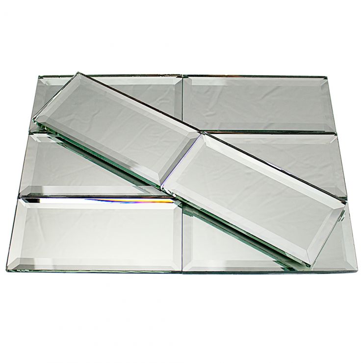 Pattern: Subway. Size: 4 x 8 inches. Material: Silver/Aluminium Mirror. Finish: Beveled. Color: Shiny Silver. Application: Wall Only. Location: Kitchen Backsplash, Bathroom, Indoor, Kitchen, Shower.
